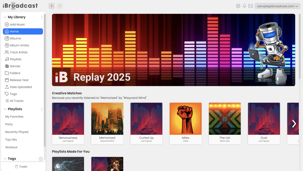 December 10, 2025Our year-end recap feature, iBroadcast Replay, is now live for 2025 — bringing you a full breakdown of your listening habits for the past year! From your top tracks to your most listened albums and favorite artists, Replay delivers a personalized snapshot of your music journey.